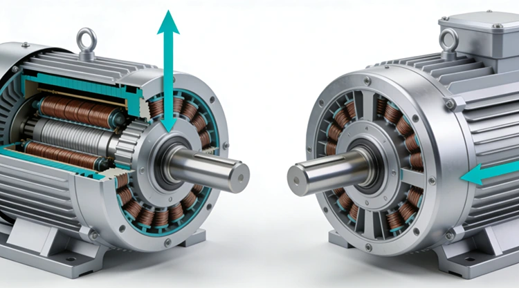 Aksial fluks (venstre) vs. radiell fluks (høyre) tverrsnitt